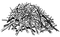 BUILDING BETTER BRUSH PILES - Part 1 by Dr. Bruce Gabrielson There are probably as many different designs for brush piles as there are Beaglers who build them. There are also probably many people who build piles with no attempt at design at all. For a brush pile to work, they should be designed to provide good cover for rabbits while at the same time allow for the ability to quickly flush rabbits, provide internal ventilation and be easy to maintain. Certainly this is a goal that many rabbit habitat builders attempt to reach. This article deals with one of the brush piles that has become the most popular design in my starting pen so far as rabbits are concerned. It is also one that meets the other goals of a good design. Besides those connected to rabbit dens, I have three different designs that I personally maintain for the rabbits in my starting pen. This design is the largest takes the most time to create, but it also is the most likely place where I can flush older rabbits, plus it seems to be a magnet for small rabbits once they leave their den. I call this design the "Fort" since my kids liked to use it as a fort in the fall when they were younger.